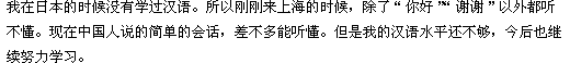 (訳:日本にいたときは中国語を勉強したことがなかったので、上海に来たときは「こんにちは」と「ありがとう」以外は聞き取れませんでした。今は簡単な会話でしたら大体わかります。でも中国語レベルはまだこれからなので、続けてがんばって勉強していきたいです。)