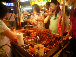 有名な士林夜市の屋台です。何を串刺しにしているか、一目では判断がつきにくいです。食べる際にはお店の衛生状態をチェックしましょう。